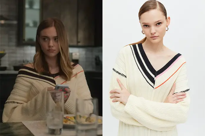 Ellie (Isabel Gravitt) porte ce pull de type cricket avec un col asymétrique. Elle le porte oversize, ce qui déplait à son père, dans The Watcher 1×01, sur Netflix.