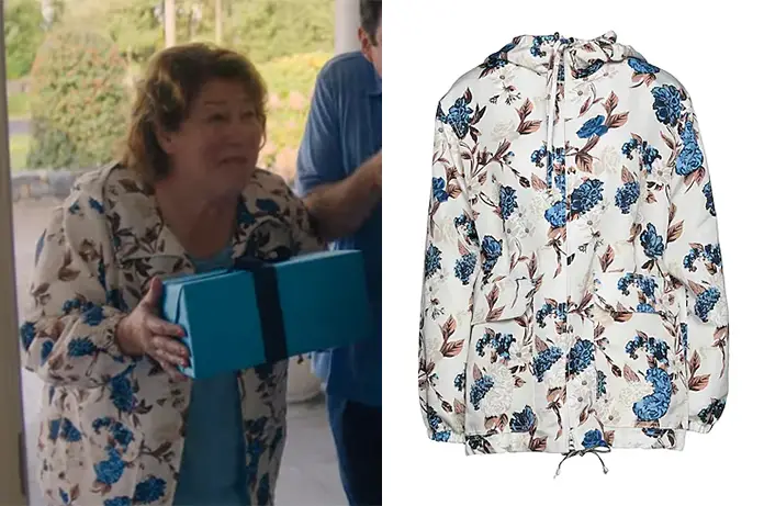 Mo (Margo Martindale) offre un cadeau à son nouveau voisin. Elle porte, dans The Watcher 1×02, une chouette veste à fleurs. On la trouve ici
