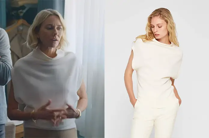 Nora (Naomi Watts) profite de son motel dans The Watcher 1×02, avec ce top blanc, à col montant.