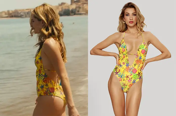Daphne (Meghann Fahy) ne sait pas encore ce qu’elle va découvrir quand elle entre dans l’eau dans The White Lotus 2×01. Elle porte un maillot une pièce jaune avec des étoiles de mer imprimées.