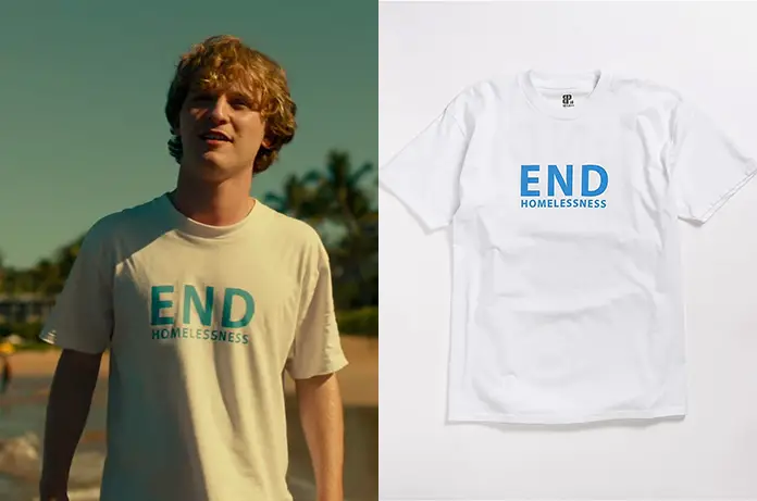 Voilà donc la tenue de Quinn (Fred Hechinger) dans le 5e épisode de The White Lotus. Il porte un t-shirt avec l’inscription « End Homelessness ». On en trouve encore des extra larges ici