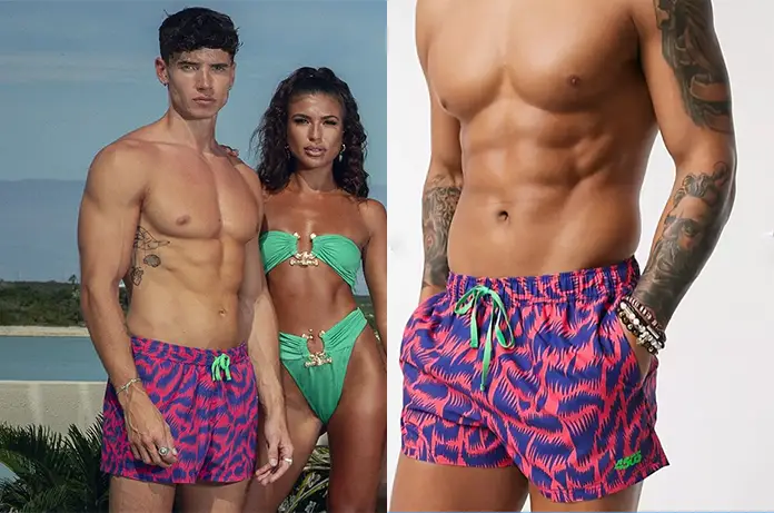 Cam Holmes portait ce joli short de bain à motifs abstraits dans le 1er épisode de Séduction haute tension (Too hot to handle) sur Netflix.