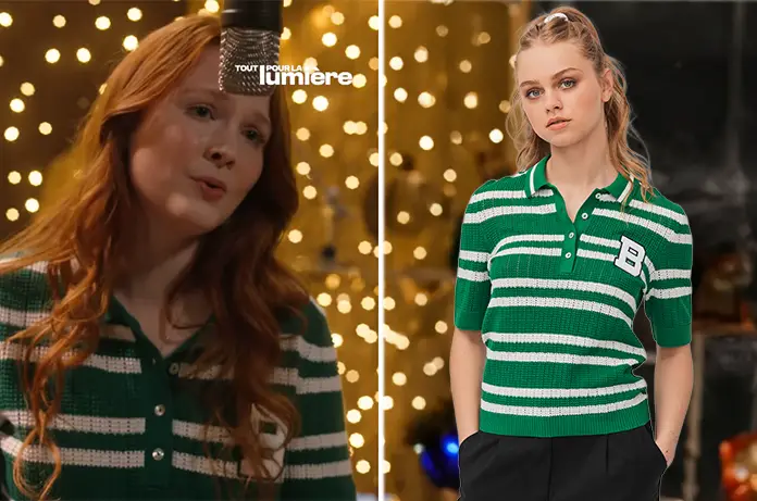 Élise Verzeroli (Marie Alexandre) porte cette chemise à manches courtes, à rayures pour chanter Si seulement j’avais su (que l’on retrouve dès maintenant sur toutes les plateformes), dans le douzième épisode de Tout pour la lumière, diffusé sur Tf1, RTL-TVi, Netflix.