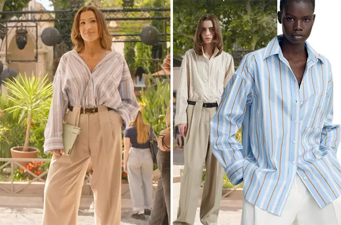Elle assortit ce pantalon à une large chemise rayée H&M, sold out