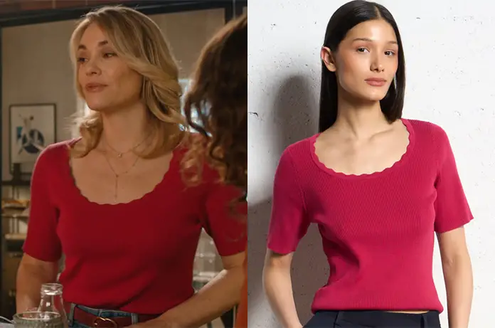 Victoria Vargas (Joy Esther) porte ce petit pull ajusté manches courtes rose dans le douzième épisode de Tout pour la lumière, diffusé sur Tf1, RTL-TVi, Netflix. Il se démarque par son joli col rond festonné.