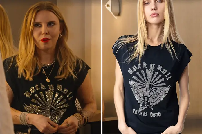 Maddie Duchassin (Charlie Loiselier) , porte ce t-shirt noir « Rock n roll is not dead » dans le huitième épisode de Tout pour la lumière, diffusé sur Tf1, RTL-TVi, Netflix.