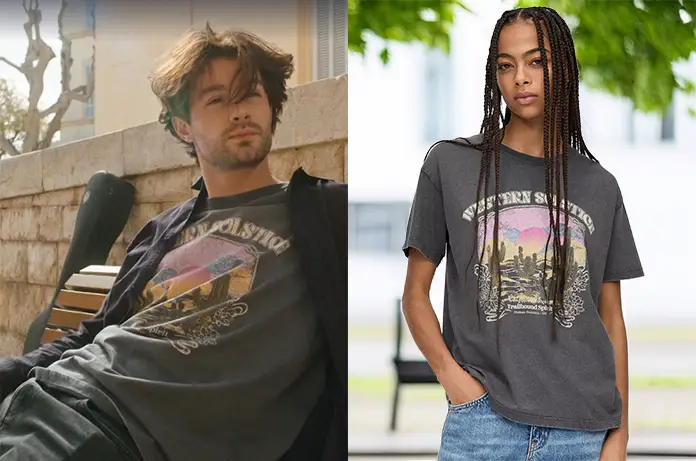 Julian Deschamps (Alex Doux) porte un t-shirt noir avec un imprimé style western dans Tout pour la lumière 1×15.