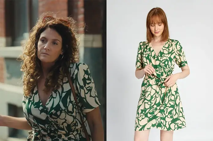 Dans Trentenaires 3×04, sur Auvio, Sophie (Carole Matagne) revient à Charleroi dans une robe portefeuille : cette pièce se distingue par son imprimé abstrait aux motifs végétaux vert émeraude sur fond beige clair, créant un contraste à la fois vif et sophistiqué. La robe est plutôt festive, alors que l’humeur de Sophie tend vers la mélancolie.