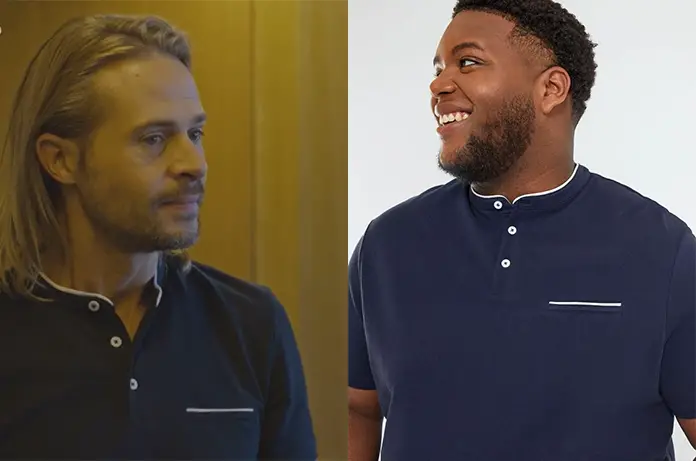 Vince (Benjamin Ramon) porte un polo bleu marine, col mao dans Trentenaires 2×10. Un modèle Kiabi.