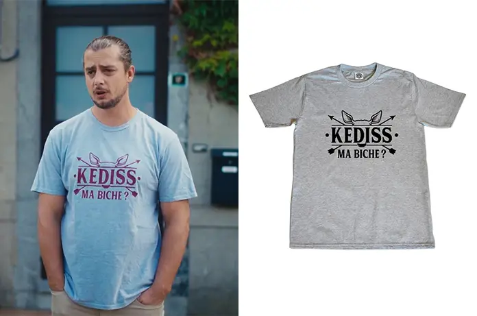 Lucas (Boris Prager) porte ce t-shirt « Kediss ma biche ? » dans l’épisode 4 de la saison 3 de Trentenaires, sur Auvio.