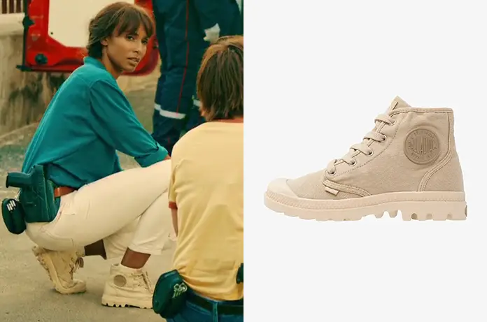 Dans l’épisode 3×04 de Tropiques criminels diffusé sur France 2, Mélissa (Sonia Rolland) est témoin de mort de la victime. Quand elle se penche sur cette dernière, on aperçoit ses bottines beiges.