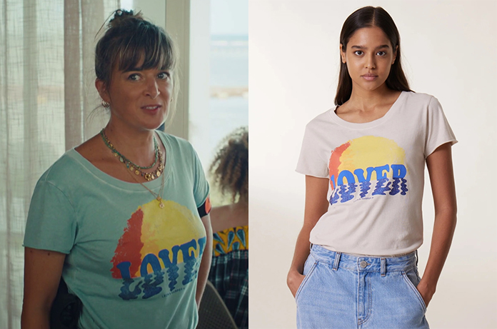 Gaelle (Béatrice de la Boulaye) porte un t-shirt avec le mot LOVER qui se semble se refléter dans l’eau au début de Tropiques criminels 7×06.