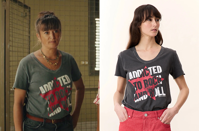 Dans le même épisode, Gaelle porte aussi un t-shirt « Addicted to Rock and Roll », dispo ici