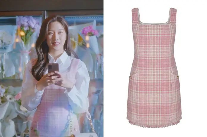 Im Ju-Gyeong (Moon Ga-Young) se rend à son date, dans True Beauty 1×04, dans cette robe rose à carreaux.