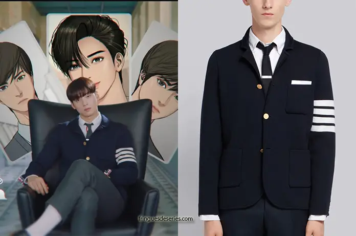 Les 4 bandes blanches permettent de reconnaitre facilement la marque de la veste de Su-Ho (Cha Eun-Woo) dans le générique de True Beauty. Il s’agit de la veste de sport Thom Browne : en rupture de stock, elle était disponible ici
