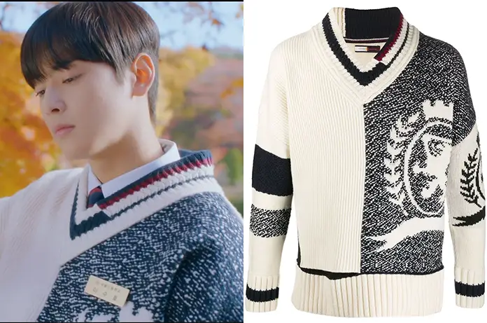 Dans un flash-back, on voit Su-Ho (Cha Eun-Woo) porter ce pull avec col en V très graphique dans True Beauty 1×02. On le trouvait ici.