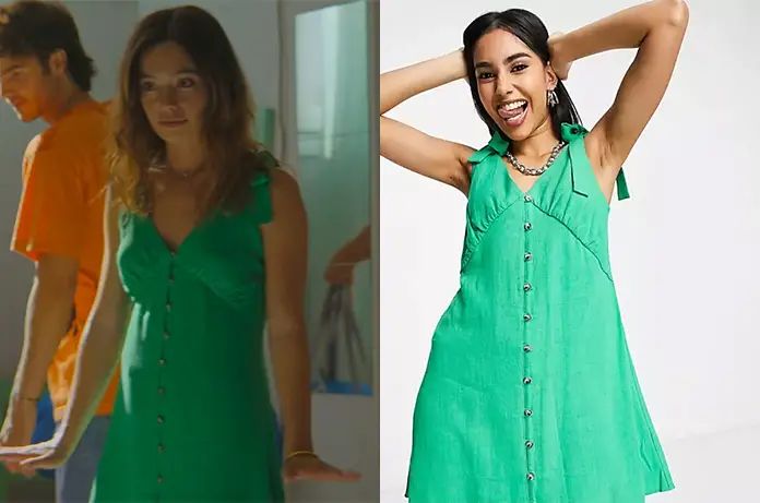 Margot (Anna Castillo) porte cette petite robe verte, boutonnée par devant, avec des nœuds sur les épaules, dans Un conte parfait (Un cuento perfecto) épisode 4.
