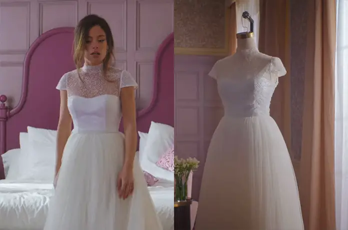 Elle porte une très jolie robe de mariée : du tulle, du tulle, du tulle blanc cassé, pour les différentes couches de la jupe. Le corsage est semi-transparent et présente un col de cygne et des petites manches ; la partie supérieure est en tulle de soie et brodée de plus de 1 000 petites perles, pour donner un effet de « pluie d’étoiles ». Cette robe est signée Alejandro Postigo (source de l’info : https://www.utreradigital.com/web/2023/07/27/utrerano-alejandro-postigo-autor-vestido-novia-serie-netflix-protagonizada-conocida-actriz-anna-castillo/)