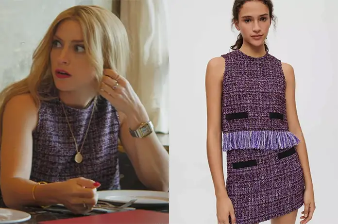 Patricia (Lourdes Hernández) porte cet ensemble en tweed violet dans l’épisode 2 d’Un conte parfait (Un cuento perfecto). Il s’agit d’un ensemble (top et jupe) de la marque Maje.