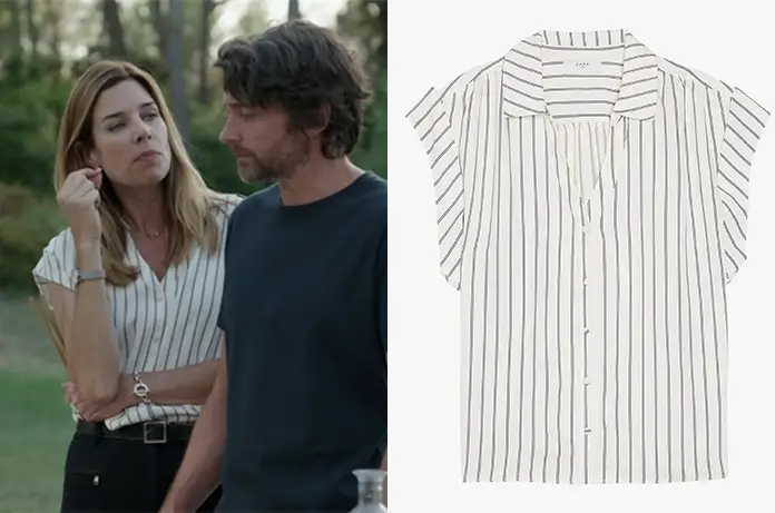 On ne vous avait pas encore parlé de la blouse à rayures que porte parfois Cécile Alphand (Marie-Gaëlle Cals) dans Un si grand soleil. On la retrouve dans l’épisode 977. Elle est en viscose, avec des manches courtes et larges, en biais à revers.