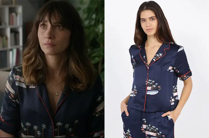 Julie Deville (Sophie Staub) apprend ce qui est arrivé à Myriam dans l’épisode 968 d‘Un si grand soleil (France2 ) Elle porte une chemise à manches courtes bleu marine, avec un col tailleur et un imprimé palmiers.