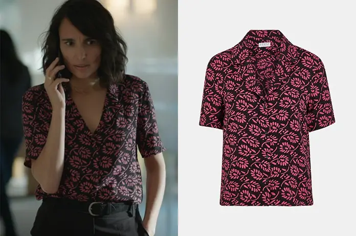 Myriam (Pauline Paolini) reçoit un coup de fil très inquiet dans Un si grand soleil 713. Elle ne se laisse pas démontée dans sa petite chemise fleurie rose et noire. On la trouve ici