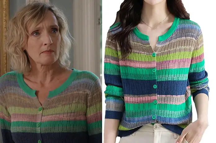 Alix (Nadia Fossier) porte ce petit cardigan à rayures colorées dans Un si grand soleil épisode 1832. On le trouve ici