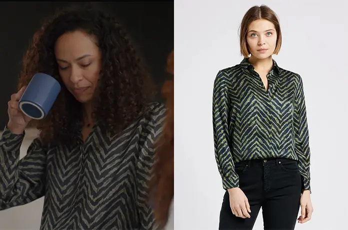 Stéphanie (Soraya Hachoumi) porte ce chemisier imprimé dans Un si grand soleil épisode 1423.