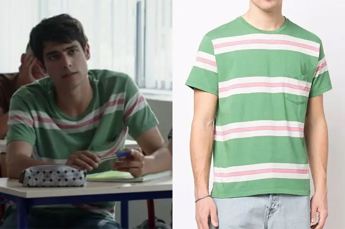 Louis Mourre (Sylvain Boccara) porte, en classe, un t-shirt vert, style vintage, avec rayures roses et blanches, dans Un si grand soleil 978. On le trouve ici.