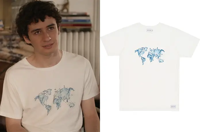 Dans Un si grand soleil 717, Antonin (Nathan Bensoussan) emménage dans sa coloc avec un t-shirt qui représente une carte du monde formée par de l’eau. Le modèle s’appelle waterworld et est créé par la marque basque Bask in the sun