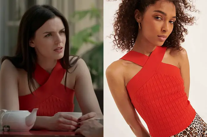 Margot (Clara Botte) porte un top rouge avec des bandes croisées qui font son originalité dans Un si grand soleil 967. On le trouve ici
