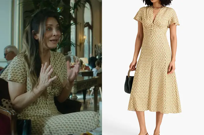 Pour son arrivée dans le Sud de la France, Alice porte une magnifique robe midi de chez Claudie Pierlot. Fidèle à l’esthétique « chic décontracté » de la marque parisienne, cette robe incarne parfaitement le look d’une touriste élégante en voyage pour Arles.