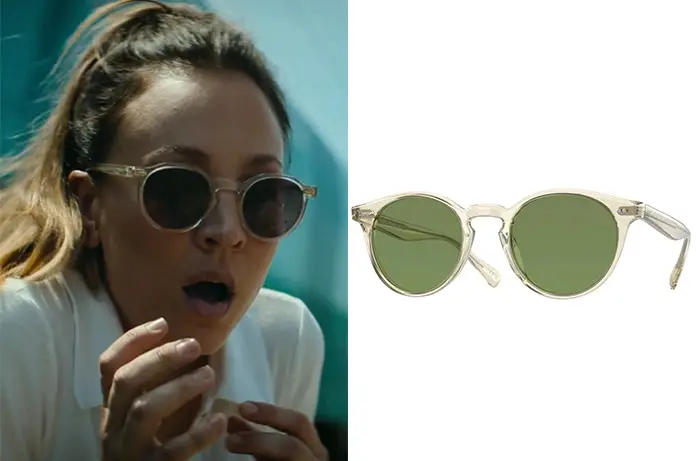 Elle porte avec cela des lunettes de soleil aux montures transparentes avec des verres foncés : le modèle Oliver Peoples Romare OV5459SU