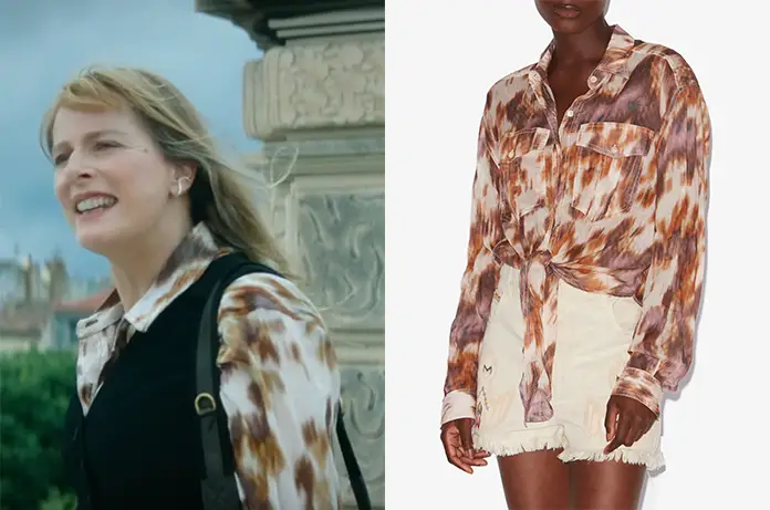 Pour sa rencontre avec Alice, Hélène (Karin Viard) affiche un style « arty-chic » typique du Sud de la France. Elle porte une chemise fluide à l’imprimé marbré ou « Ikat » dans des tons de terre brûlée, de beige et de brun.