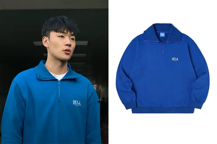 Go Hyun-tak (Lee Min-Jae 이민재) porte un sweat bleu avec l’inscription Ucla, dans Weak Hero Class 2 épisode 3 (약한영웅, Héros fragile Niveau 2).
