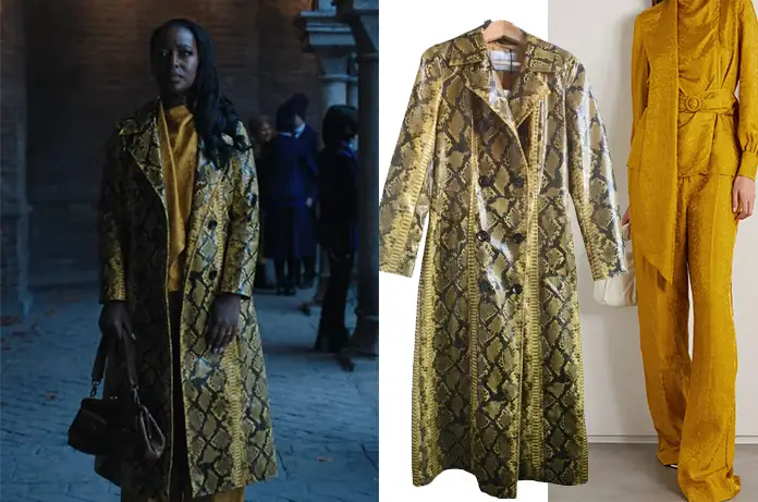 Dans Wednesday (Mercredi) 1×05, Gabrielle (Gracy Goldman) rend visite à sa fille Bianca avec cette chemise moutarde sous ce manteau remarquable façon python.
