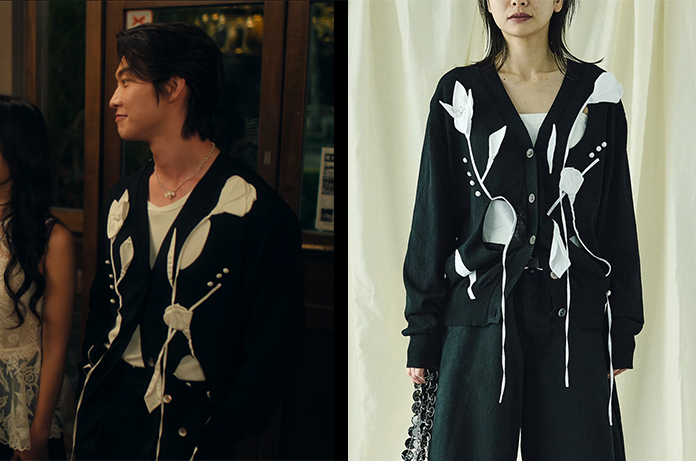 Min-Ho a choisi un cardigan noir issu de la collection printemps/été 2025 du label RIV NOBUHIKO (collaboration unique entre la designer coréenne River Garam Jang et le designer japonais Nobuhiko Kohama).