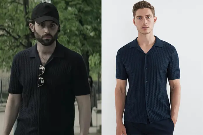 Joe Goldberg (Penn Badgley) a changé de nom pour Jonathan Moore dans la saison 4 de You. Il se balade à Paris avec cette chemise bleu marine, texturée, de style rétro de la marque French Connection.