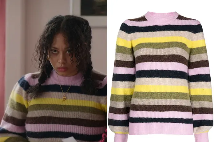 Felice (Nikita Uggla) est surprise du départ de Wilhelm dans Young Royals 2×02. Elle porte un pull en alpaga, à rayures horizontales de diverses couleurs, un petit col montant et des manches ballon.