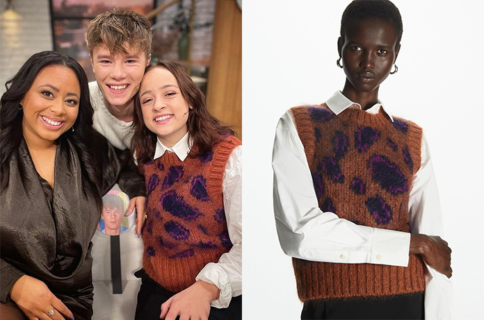 Frida Argento, qui joue dans Young Royals saison 2 sur Netflix, porte ce très joli pull sans manches en mohair, brun avec taches violettes, sur une photo promo de la série.