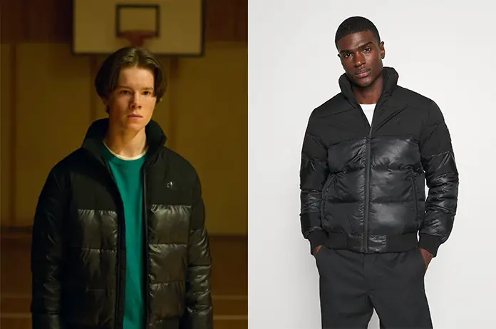 Dans Young Royals 1×03, le prince Wilhelm règle ses comptes avec son cousin August. Il porte une doudoune noire Calvin Klein. Il en reste une ici