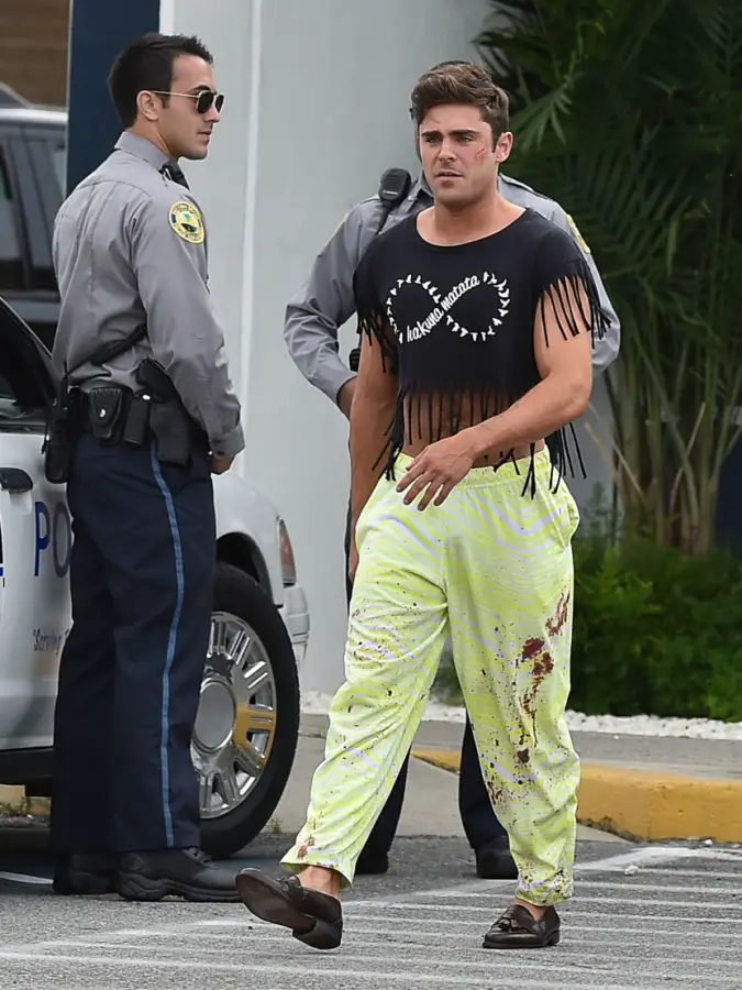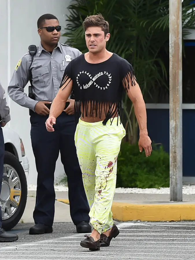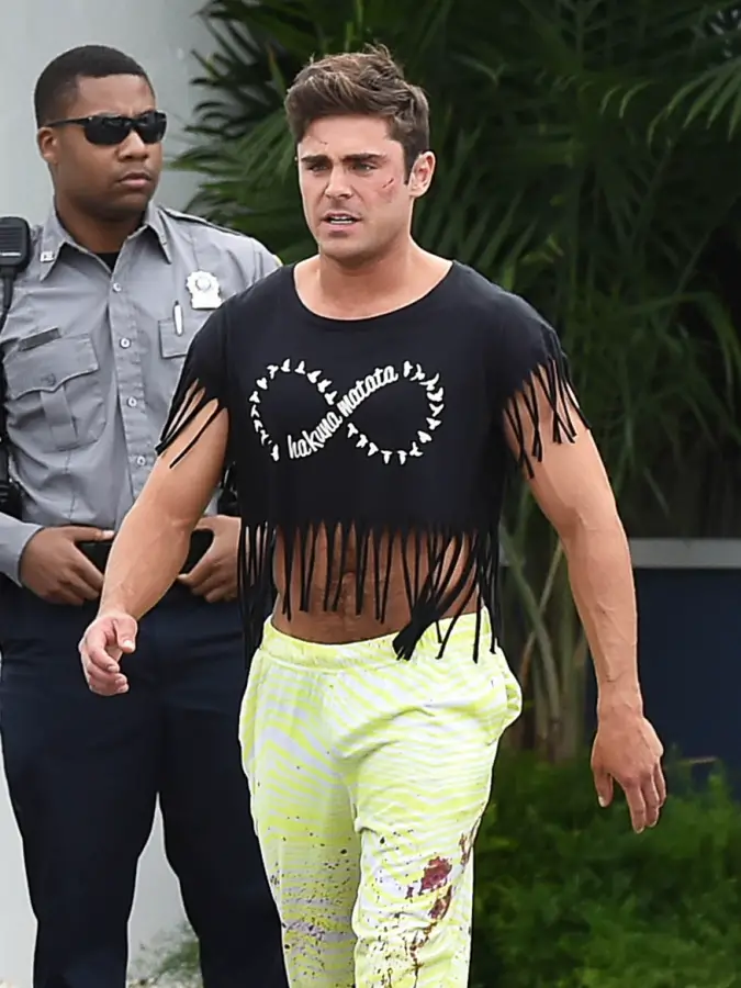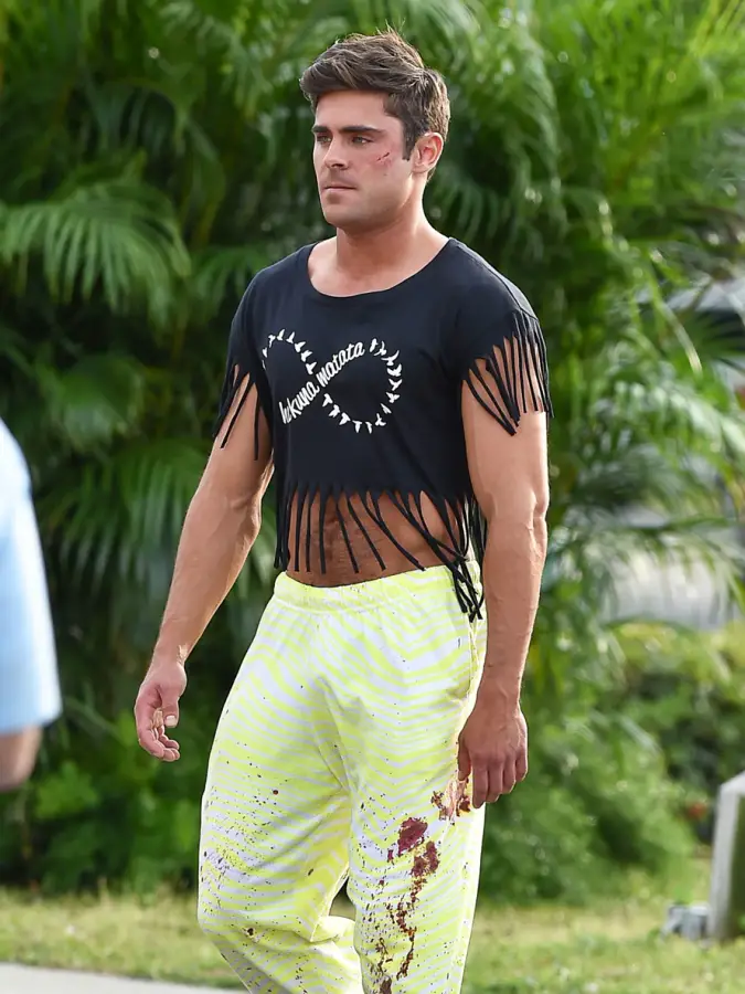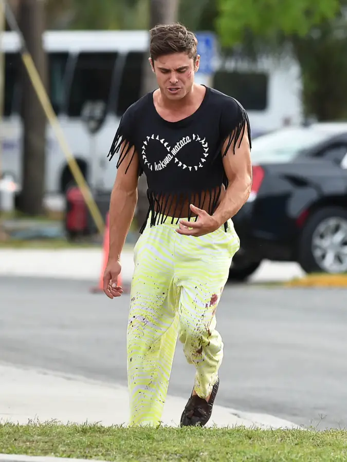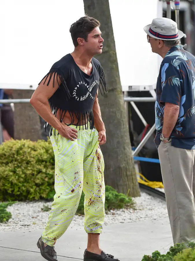 Il s’en passe des choses sur le tournage de Dirty Grandpa, avec Robert de Niro. On y a vu l’acteur Zac Efron en habits de filles : un top très girly, tout frangé, avec la mention Hakuna Matata et un pantalon jaune maculé de sang. Le tout donne un effet ravissant que nous ne conseillerions toutefois pas à tout le monde.
